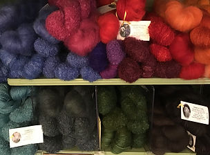 I have been an avid knitter most of my life. I love yarn! When we moved to South Hero, we decided to raise Angora goats to begin creating our own line of mohair blend yarns. Yellow Dog Farm began in 2005. These goats are sheared twice a year for their mohair fiber. Each goat produces about 12 pounds of fiber per year. This fleece is mixed with sheep’s wool to ensure the elasticity of the yarn. Our blended fibers are then mill spun into several yarn types. This mill spun fiber is then home-dyed or hand painted before being gathered into skeins. I do all of the dying by hand, some in solid colors, others painted with 2 or 3 different colors. The yarn that we produce is considered an exotic fiber. It has a great loft to it. Some of our fleece is also carded into rovings for hand spinning. A Majacraft Rose spinning wheel is used to produce the handspun yarns. Most yarns are two-ply sport or worsted weight. The yarn is then measured and skeined using an antique yarn winder.